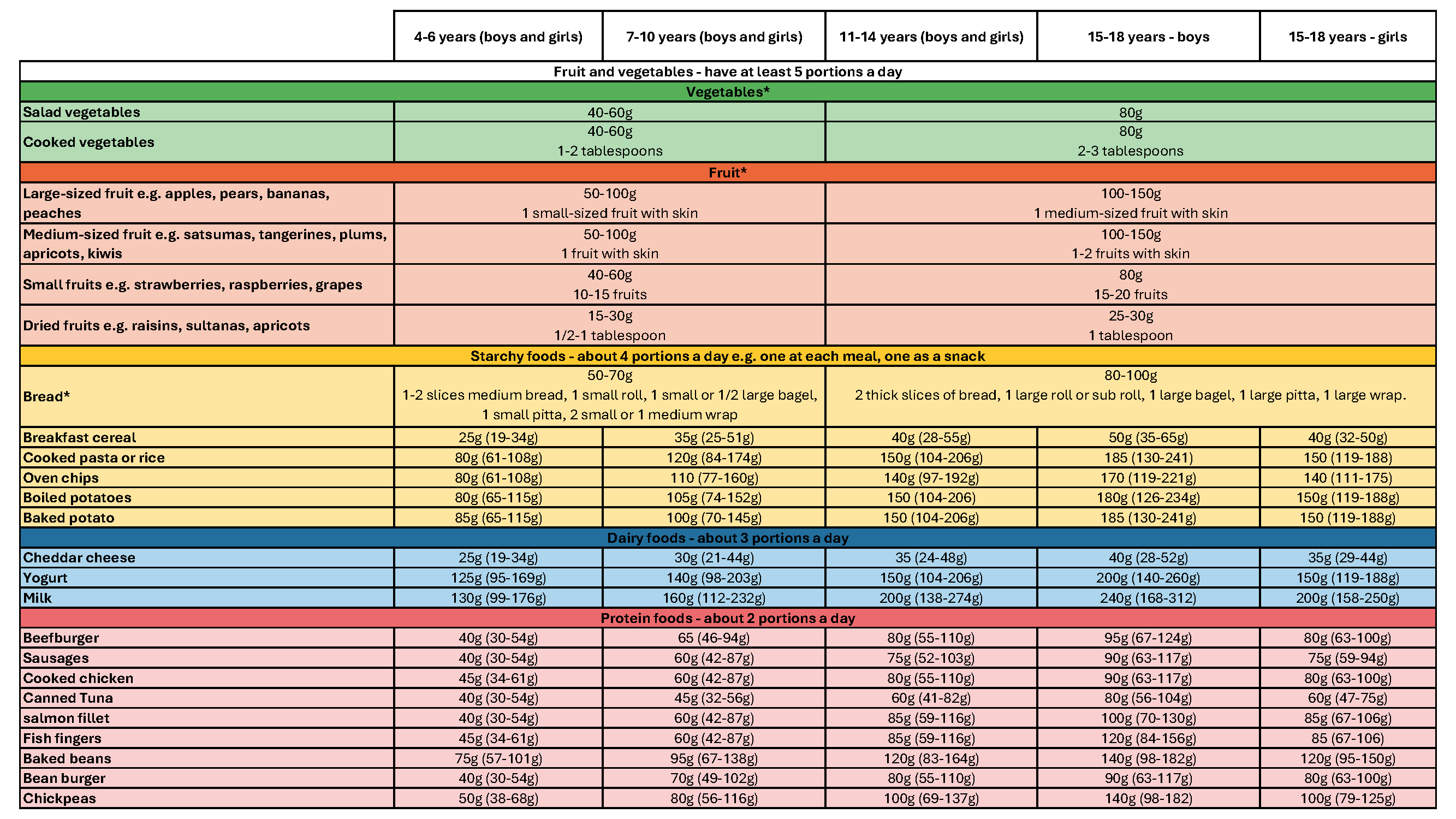 For many foods there is a portion size and a range (in brackets) to allow for children of different sizes, different amounts of physical activity and how quickly they are growing.