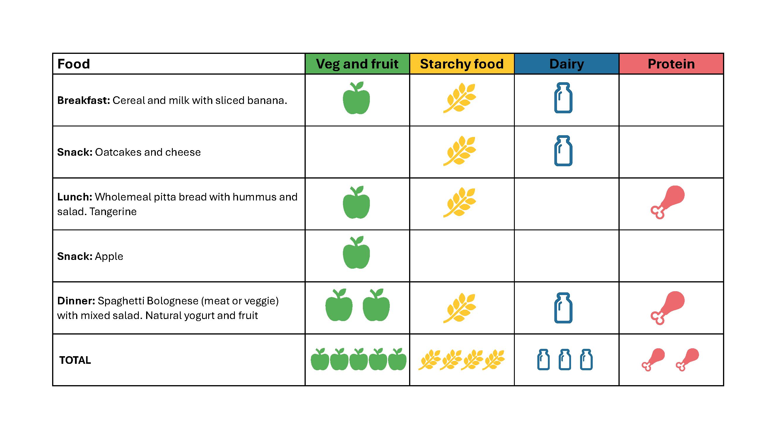 - Get a balance from the main food groups across the day
